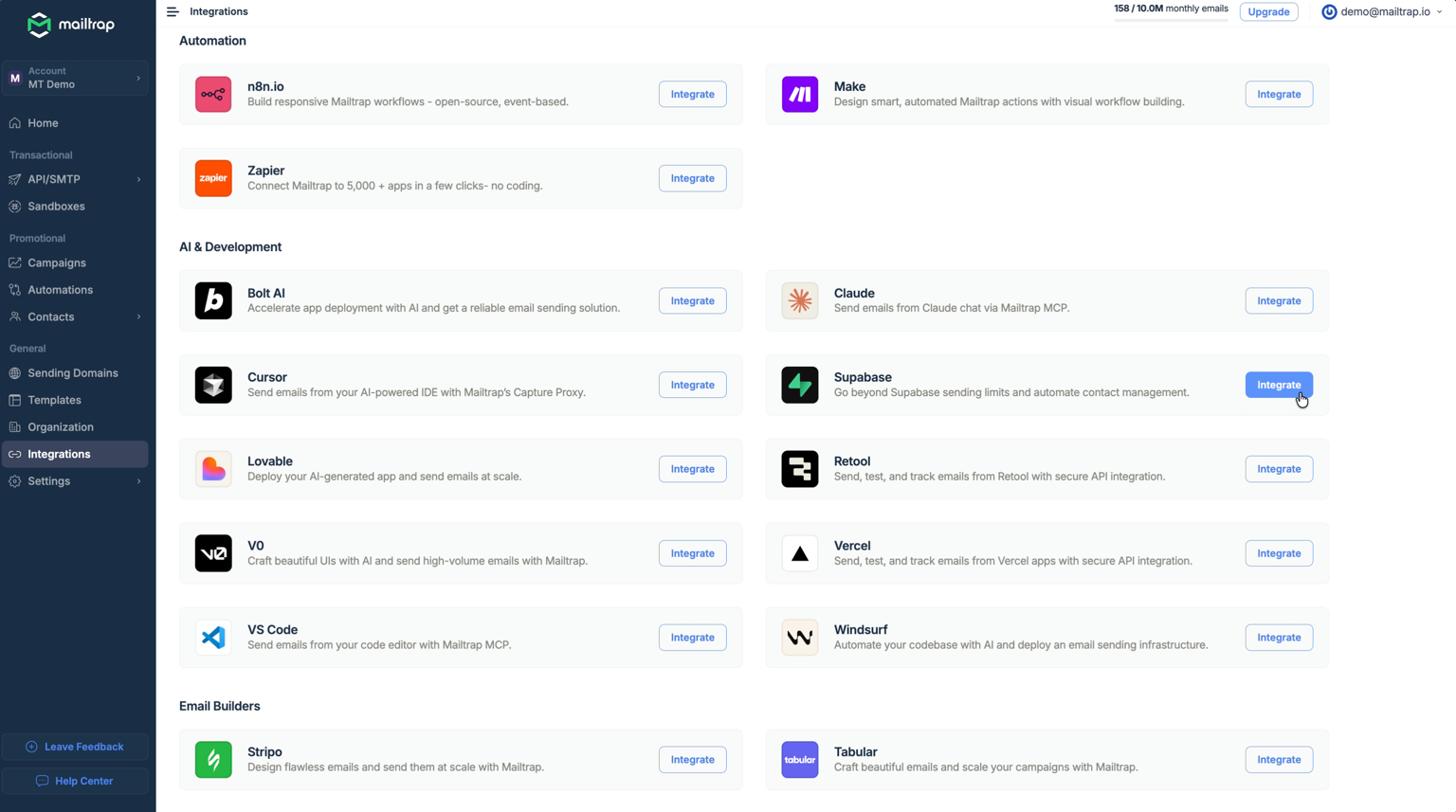 Mailtrap’s native integration with Supabase streamlines your workflow by automatically populating your Supabase project with Mailtrap’s SMTP credentials. You can access this setup via the Integrations page in Mailtrap or through the Supabase Marketplace.