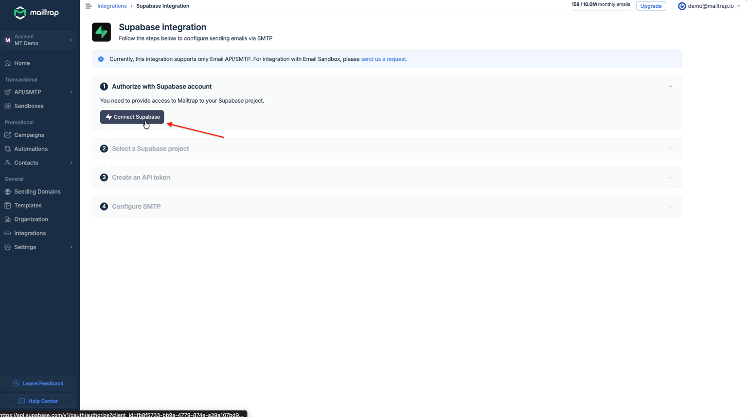 Once authorized, Mailtrap will load your available Supabase projects. Then, all you need to do is: