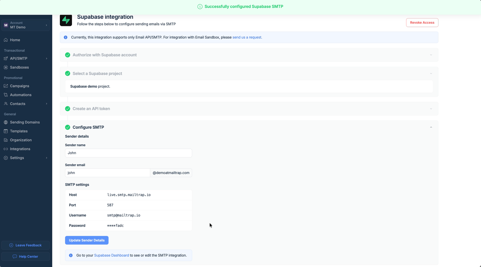 You will see a confirmation message stating: "Successfully configured Supabase SMTP."