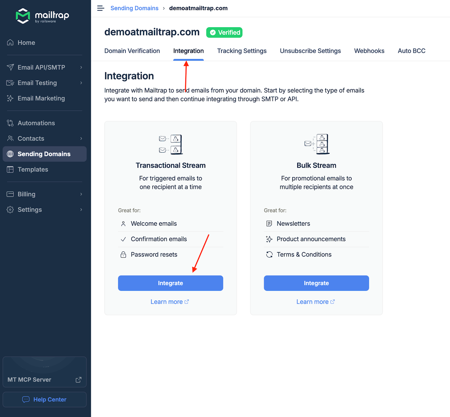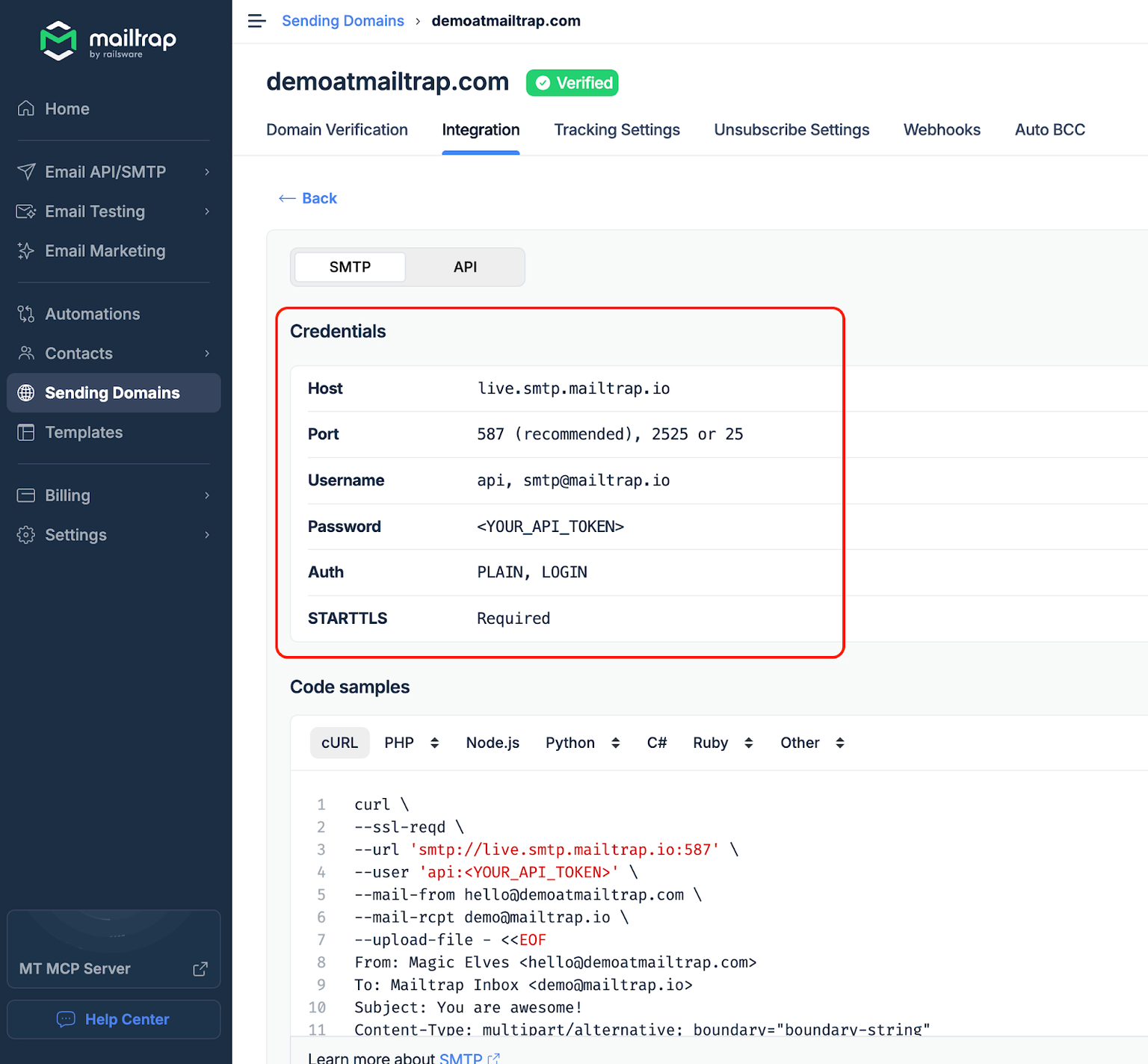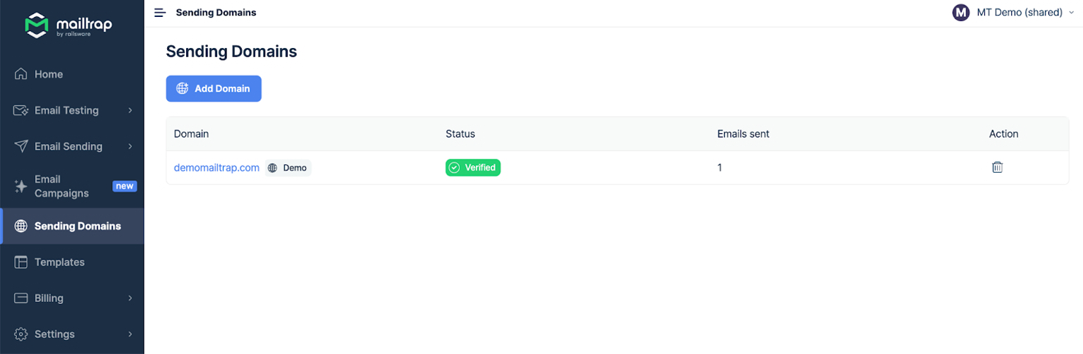 • A verified sending domain set up within Mailtrap.