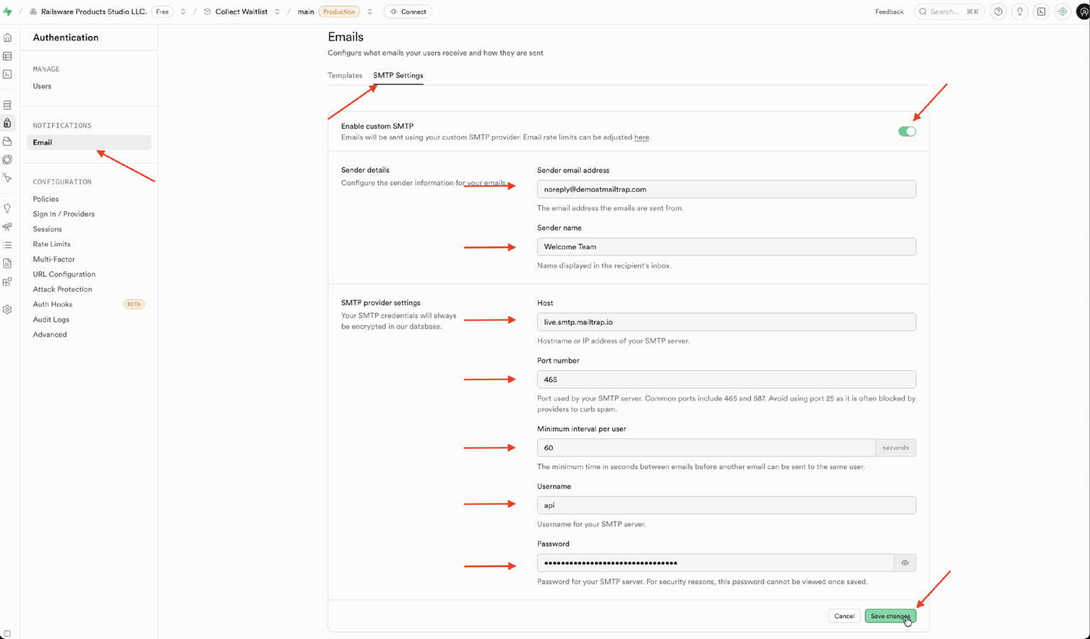 • Click on EmailsSMTP Settings and enable the Enable Custom SMTP toggle. Update Host, Port, Username, and Password with your Mailtrap credentials, then click Save changes.