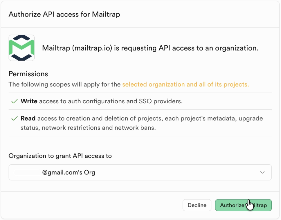 • Review the permissions for the access of your Supabase organizations and projects, and click Authorize Mailtrap.