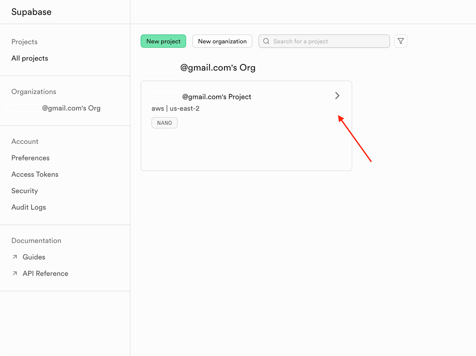 • Click the Select a Supabase project dropdown menu