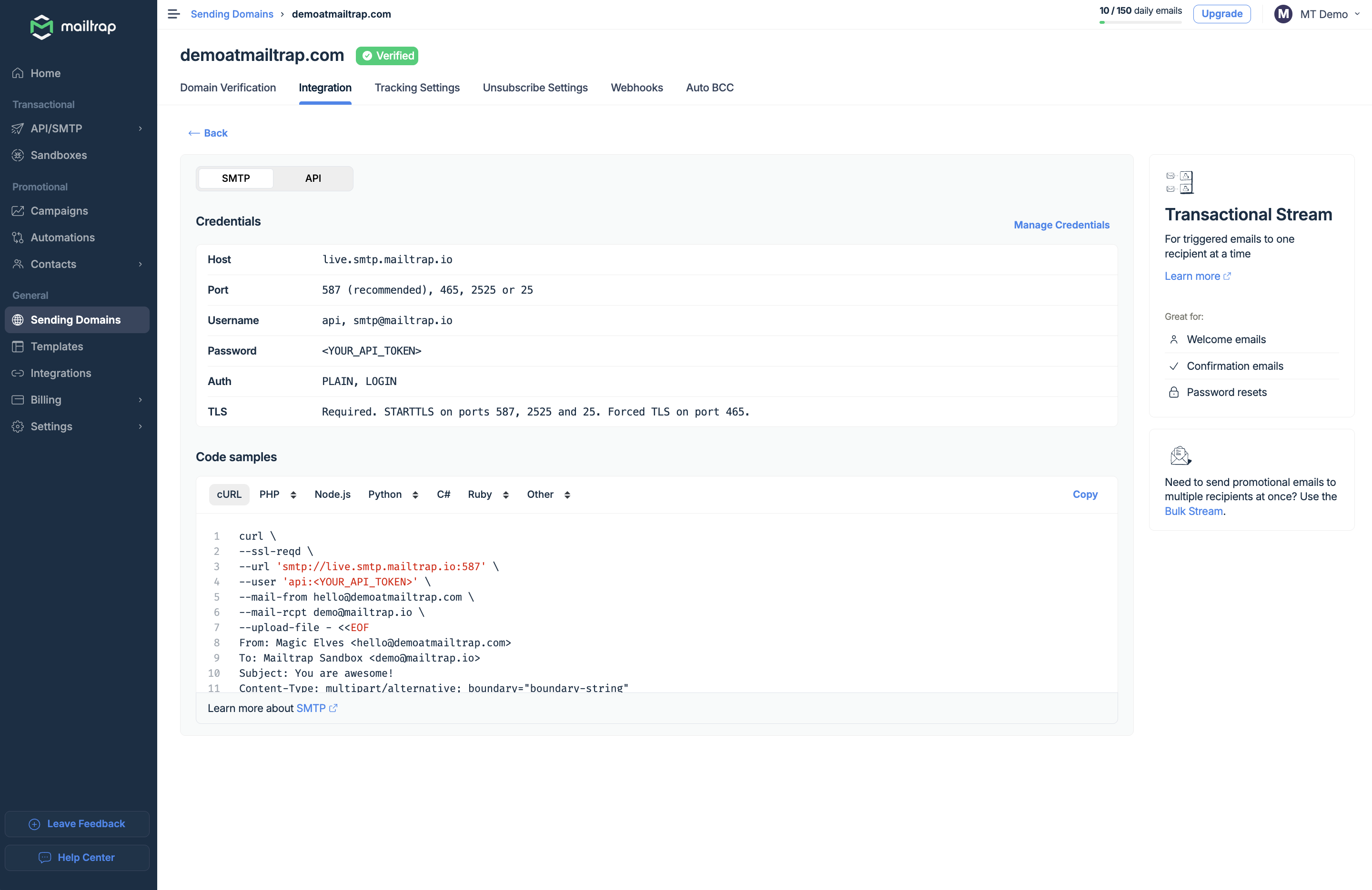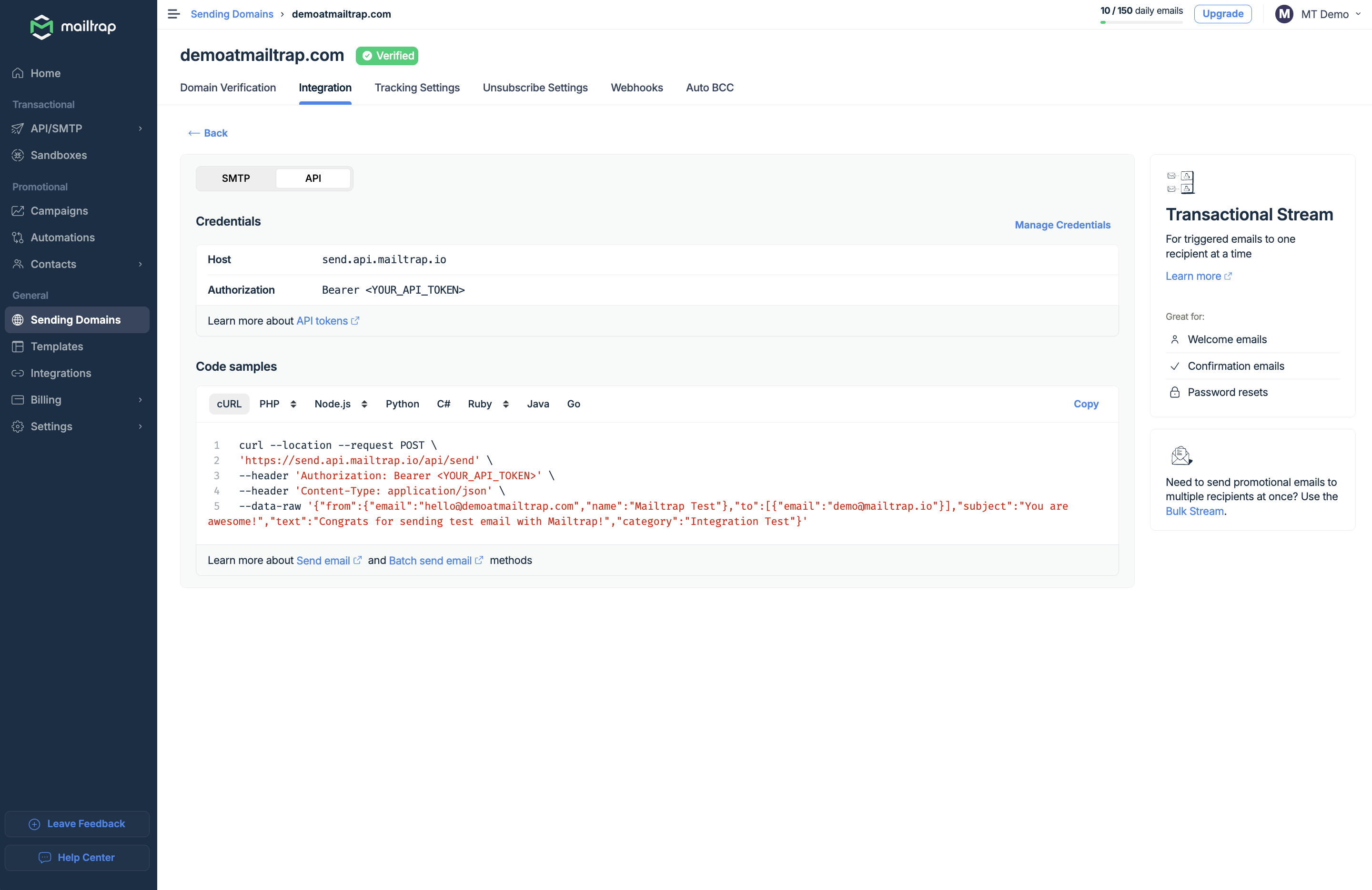 To integrate Mailtrap and send emails via cURL, use the configuration available among Code samples under the API section.
