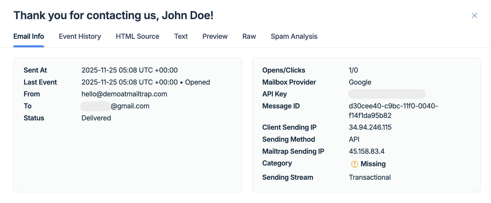 And here it is in the Email Logs tab in the Mailtrap dashboard.