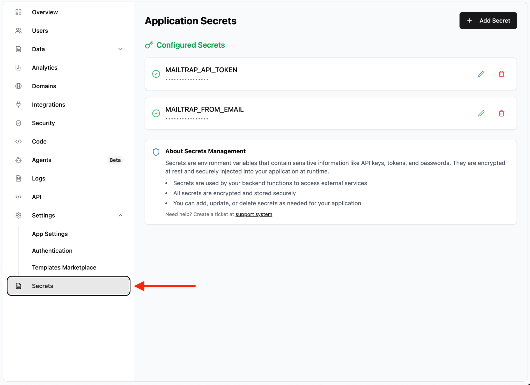 Once you’re done, go back to the dashboard and tell the Base 44 AI you’ve added secrets with the Mailtrap credentials. For this, you can use a prompt such as, for example, this one: