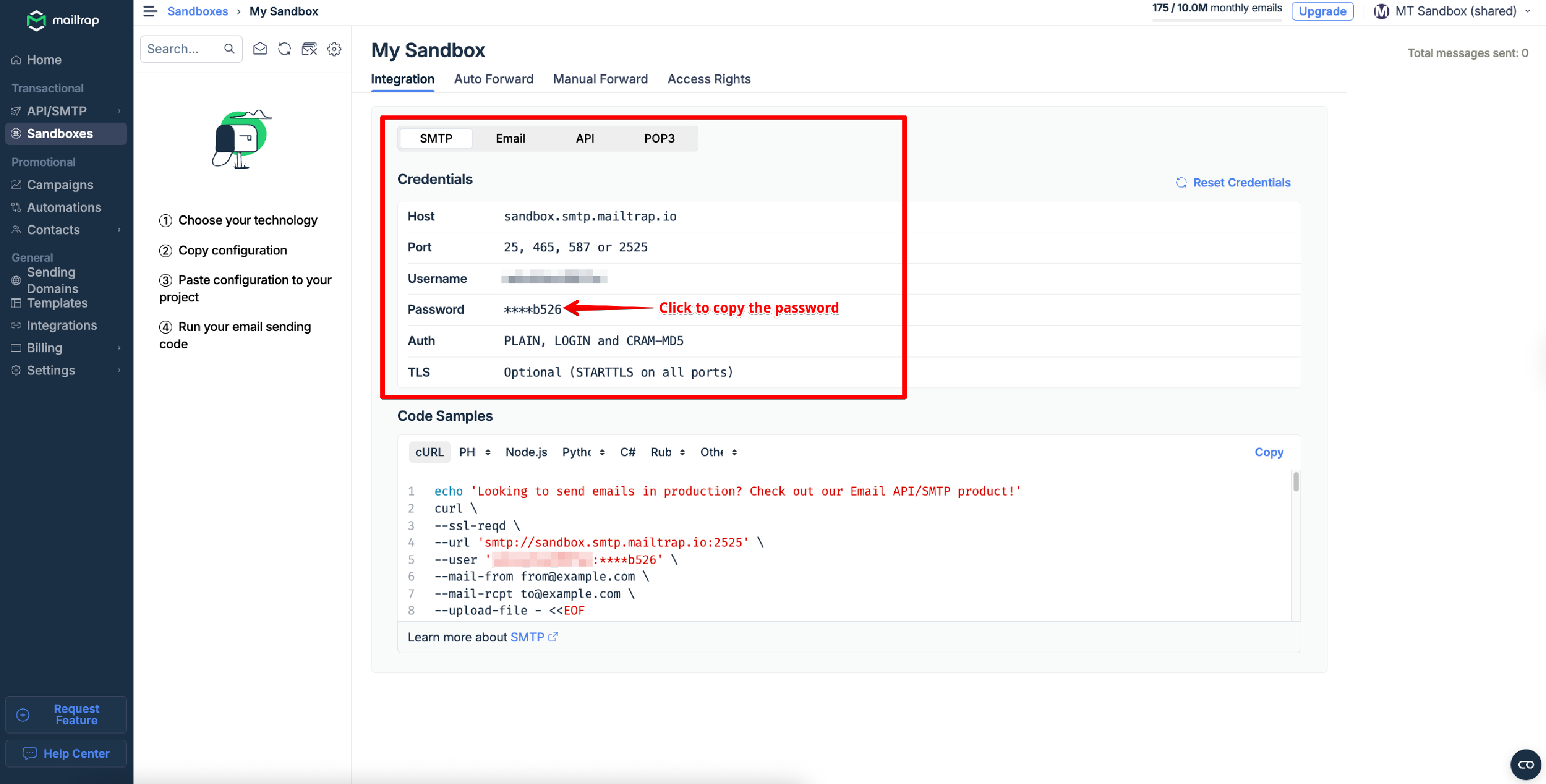 - Copy the configuration and paste it into your email-sending script. Then, run it. The email will arrive in the sandbox in a few seconds.