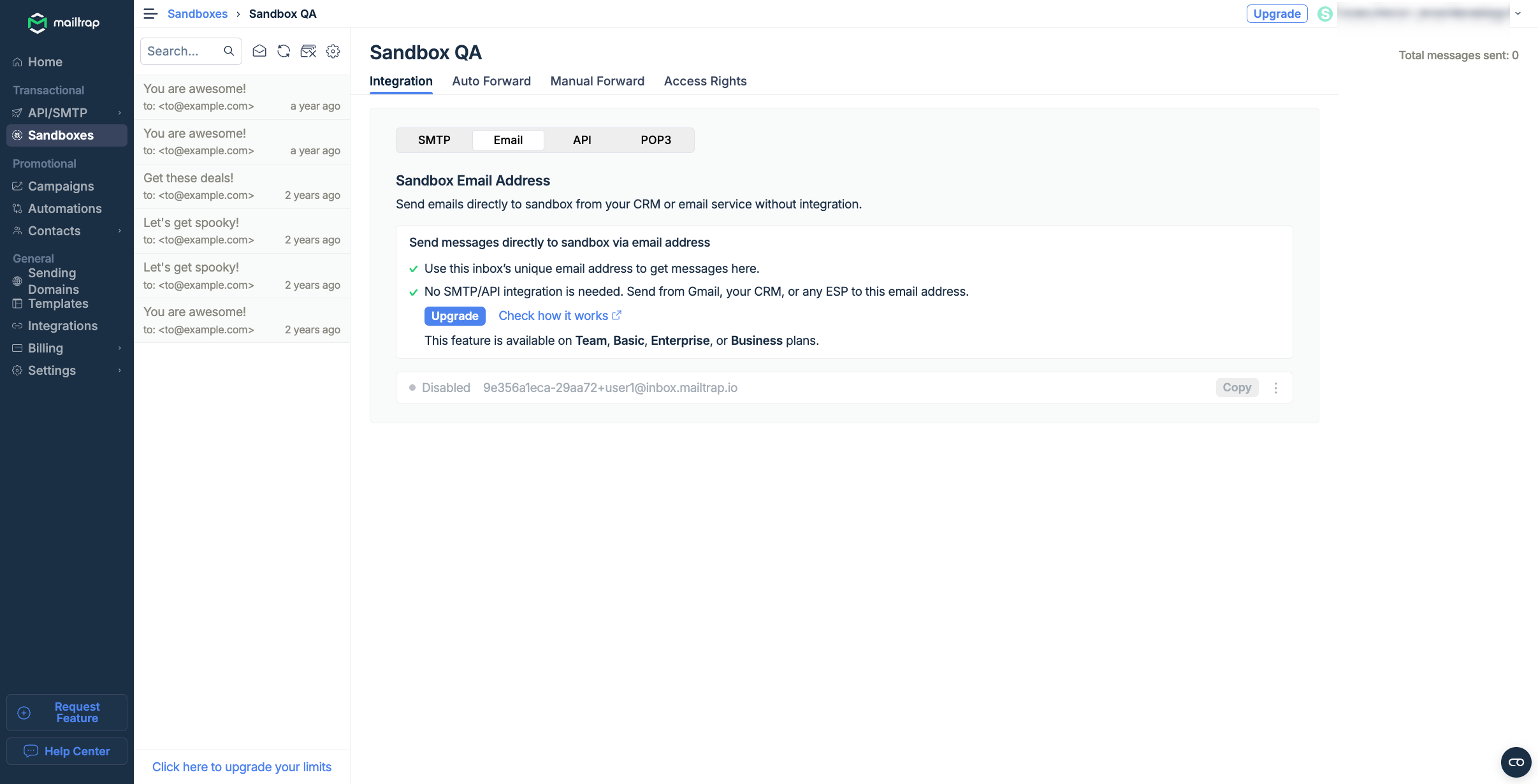 Email per sandbox is a premium feature available in the Basic, Team, Enterprise, or Business plans.