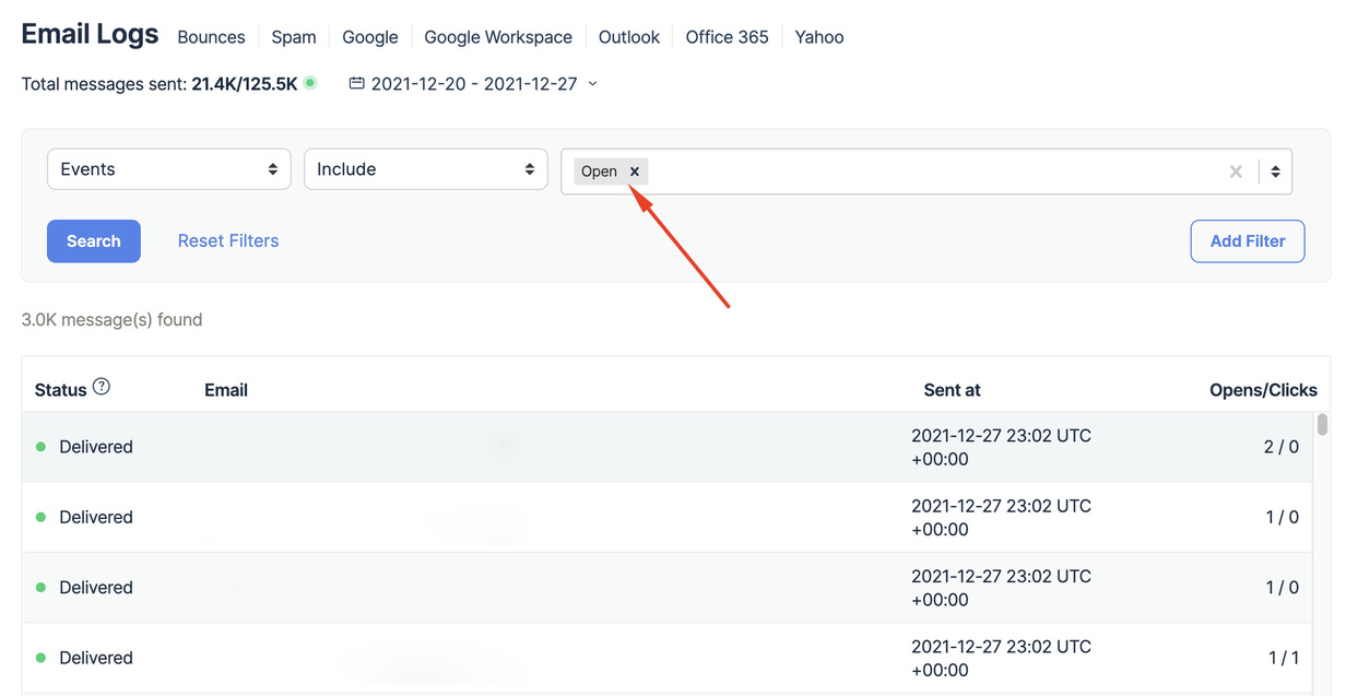 The stats include the number of Delivered emails. You can also see Unique Opens and Unique Open Rate, as well as Clicked emails and Click Rate.